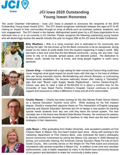 Please recognize the following outstanding young Iowans who will deservingly receive the awards virtually this year on August 29th at the JCI Iowa All-state Conference: